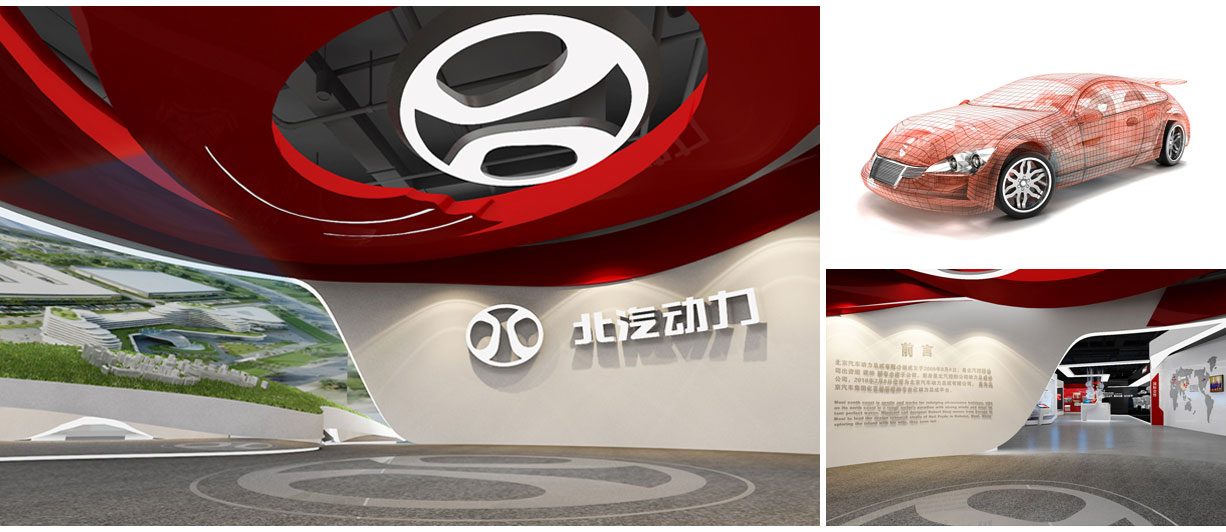 整体以红白为主体颜色,以不锈钢稍作点缀,以红色丝带的理念为创意灵感,环绕的红色绸带环绕盘旋上升,展示出北汽集团的雄伟蓝图。